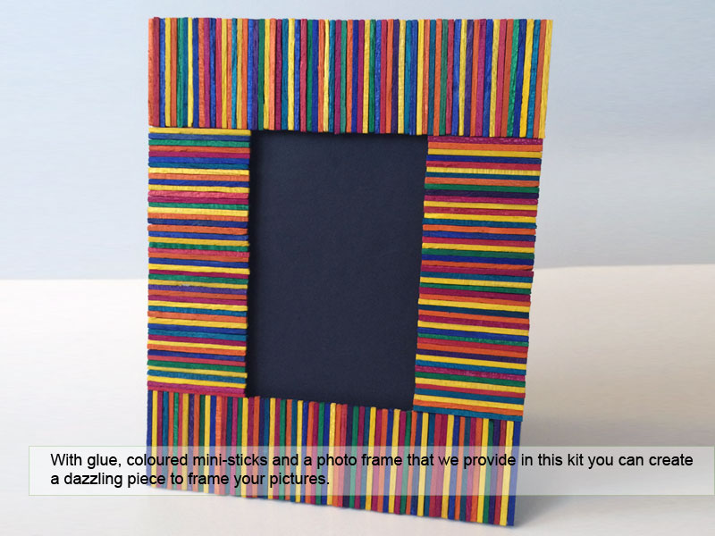 With glue, coloured mini-sticks and a photo frame that we provide in this kit you can create a dazzling piece to frame your pictures.